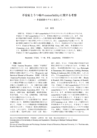 本稿では,不安症とうつ病のcomorbidityのプロセスやメカニズムを明らかにするため,不安症とうつ病のcomorbidityについて,多角的に検討することを目的とした。まず,不安症の発症年齢や有病率,併存率といった疫学調査の結果を概観し,不安症が早期から発症し,他の不安症やうつ病と併発しやすいことを示した。次に,comorbidityの定義について,用語の整理と病因モデルに関する先行研究を概観した。そして,代表的なモデルである3因子モデル(Clark & Watson, 1991),強化感受性理論(Gray, 1987, 1991),多重経路モデル(Cummings et al., 2014)を概観し,実証的な知見によってそれぞれのモデルを検証したところ,発達段階と不安症間の不均一性に着目することが重要であることを示した。最後に,不安症とうつ病のcomorbidityに関する研究の意義と今後の課題について述べた。