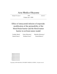 | Abstract | The effect of intracarotid infusion of etoposide on the permeability of the blood-brain barrier (BBB) and brain-tumor barrier (BTB) was investigated using a model of rats injected with C6 glioma cells. Fifty four glioma-bearing rats were divided into 3 groups and treated with 0, 3, or 15 mg/kg of etoposide infused into the internal carotid artery. BBB or BTB permeability was evaluated qualitatively by the leakage of Evans blue (6 animals in each group) or quantitatively by the diffusion of carboplatin [cis-diammine (1,1-cyclobutane-dicarboxylato) platinum(II); CBDCA] (12 animals in each group) into the normal brain or the tumor tissue. BBB and BTB disruption augmented significantly in proportion to the dose of etoposide. The degree of disruption of BTB was greater than that of BBB, but the rate of disruption of BBB in proportion to increasing the dose of etoposide was higher than that in the BTB. Histopathologically, no obvious changes were observed in the animals of either the control group or the 3 mg/kg group but degenerative changes in the neurons of the hippocampus of the infused hemisphere were seen in the 15 mg/kg group. This change is thought to be caused by apoptosis because of the positive reaction with TdT-mediated dUTP-biotin nick-end labeling (TUNEL) method. Our results suggest that intracarotid infusion of etoposide can increase drug delivery of concurrent antitumor agents into tumor tissue, but cerebral parenchymal cell damage is expected with a higher dosage of etoposide. Therefore, the dosage of etoposide for intracarotid infusion should be lower than 15 mg/kg in order to reduce neurotoxicity of both etoposide and concurrent anticancer drugs. |