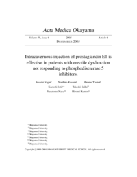 | Abstract | We report on 64 patients who did not achieve erections adequate for satisfactory sexual intercourse from among a total of 243 patients who were prescribed PDE5 inhibitors for erectile dysfunction (ED). Intracavernous injection (ICI) of PGE was performed in this non-responder group. An ICI of 20 or 40 mcg of PGE1 in 1 ml saline was performed and the responses evaluated. Forty-nine out of 64 (77 percent ) cases responded to 20 mcg of PGE1. Forty mcg of PGE was injected into the 15 non-responding cases, and 9 patients responded favorably. The overall effective rate was 58/64 (91 percent ). No major adverse effects were observed. |