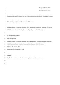| Note | This is the peer reviewed version of the following article: [Miyoshi, S, Okubo, N, Mitsumori, S. Isolation and identification of soil bacteria resistant to surfactants in washing detergents. J Surfact Deterg. 2022; 1– 5. https://doi.org/10.1002/jsde.12587], which has been published in final form at [https://doi.org/10.1002/jsde.12587]. This article may be used for non-commercial purposes in accordance with Wiley Terms and Conditions for Use of Self-Archived Versions. This article may not be enhanced, enriched or otherwise transformed into a derivative work, without express permission from Wiley or by statutory rights under applicable legislation. Copyright notices must not be removed, obscured or modified. The article must be linked to Wiley’s version of record on Wiley Online Library and any embedding, framing or otherwise making available the article or pages there of by third parties from platforms, services and websites other than Wiley Online Library must be prohibited.