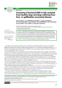 | Abstract | Although the biliary system is generally aseptic, gallbladder microbiota has been reported in humans and some animals apart from dogs. We screened and analyzed the bacterial deoxyribonucleic acid in canine gallbladders using bile sampled from 7 healthy dogs and 52 dogs with liver- or gallbladder-associated disease. PCR screening detected bacteria in 17.3% of diseased dogs (9/52) and none in healthy dogs. Microbiota analysis of PCR-positive samples showed that the microbial diversity differed between liver- and gallbladder-associated disease groups. Thus, a specific bacterial community appears to occur at a certain frequency in the bile of diseased dogs.
