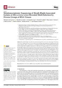 | Citation | Urzo, M.L.R.; Guinto, T.D.; Eusebio-Cope, A.; Budot, B.O.; Yanoria, M.J.T.; Jonson, G.B.; Arakawa, M.; Kondo, H.; Suzuki, N. Metatranscriptomic Sequencing of Sheath Blight-Associated Isolates of Rhizoctonia solani Revealed Multi-Infection by Diverse Groups of RNA Viruses. Viruses 2024, 16, 1152. https://doi.org/10.3390/v16071152
