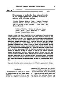 | Abstract | Clinical risk factors associated with the development of osteoporosis and vertebral fractures were evaluated in patients with asthma in relation to sex, age, and dose of glucocorticoids (GC). In 75 asthmatic patients including 44 steroid-dependent asthma, the bone mineral density (BMD) of the lumber spines was measured by quantitative computed tomography (QCT). Thirty five patients of them were followed up with radiographs over a period of 0.5 to 4 years (average: 2.6±1.3 years). The BMD was significantly lower in older (p |