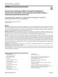 Abstract | Objectives Propolis possesses antibacterial, anti-inflammatory, and antioxidant properties. While its application in oral care has garnered significant attention, evidence supporting its effectiveness against periodontal bacteria is limited. This study used a randomized double-blind protocol to assess the safety and efficacy of toothpaste containing propolis compared to a placebo in patients undergoing supportive periodontal therapy (SPT).