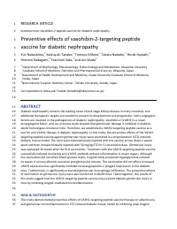 Abstract | Diabetic nephropathy remains the leading cause of end-stage kidney disease in many countries, and additional therapeutic targets are needed to prevent its development and progression. Some angiogenic factors are involved in the pathogenesis of diabetic nephropathy. Vasohibin-2 (VASH2) is a novel proangiogenic factor, and our previous study showed that glomerular damage is inhibited in diabetic Vash2 homozygous knockout mice. Therefore, we established a VASH2-targeting peptide vaccine as a tool for anti-VASH2 therapy in diabetic nephropathy. In this study, the preventive effects of the VASH2-targeting peptide vaccine against glomerular injury were examined in a streptozotocin (STZ)-induced diabetic mouse model. The mice were subcutaneously injected with the vaccine at two doses 2 wk apart and then intraperitoneally injected with 50 mg/kg STZ for 5 consecutive days. Glomerular injury was evaluated 20 wk after the first vaccination. Treatment with the VASH2-targeting peptide vaccine successfully induced circulating anti-VASH2 antibody without inflammation in major organs. Although the vaccination did not affect blood glucose levels, it significantly prevented hyperglycemia-induced increases in urinary albumin excretion and glomerular volume. The vaccination did not affect increased VASH2 expression but significantly inhibited renal angiopoietin-2 (Angpt2) expression in the diabetic mice. Furthermore, it significantly prevented glomerular macrophage infiltration. The preventive effects of vaccination on glomerular injury were also confirmed in db/db mice. Taken together, the results of this study suggest that the VASH2-targeting peptide vaccine may prevent diabetic glomerular injury in mice by inhibiting Angpt2-mediated microinflammation.