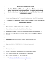 | Abstract | Enterotoxigenic Escherichia coli (ETEC) expressing the colonization factor CS6 is widespread in many developing countries, including India. The different allelic variants of CS6, caused by point mutations in its structural genes, cssA and cssB, are designated AIBI, AIIBII, AIIIBI, AIBII, and AIIIBII. A simple, reliable, and specific mismatch amplification mutation assay based on real-time quantitative PCR (MAMA-qPCR) was developed for the first time for the detection of CS6-expressing ETEC, along with the identification of allelic variations. The assay was based on mismatched nucleotide incorporation at the penultimate base at the 3' ends of the reverse primers specific for cssA and cssB and was validated using 38 CS6-expressing ETEC isolates. This strategy was effective in detecting all the alleles containing single-nucleotide polymorphisms. Using MAMA-qPCR, we also tested CS6 allelic variants in 145 ETEC isolates from children with acute diarrhea and asymptomatic infections, with the latter serving as controls. We observed that the AIBI and AIIIBI allelic variants were mostly associated with cases rather than controls, whereas the AIIBII variants were detected mostly in controls. In addition, the AIBI and AIIIBI alleles were frequently associated with ETEC harboring the heat-stable toxin gene (est) alone or with the heat-labile toxin gene (elt), whereas the AIIBII allele was predominant in ETEC isolates harboring the elt gene. This study may help in understanding the association of allelic variants in CS6-expressing ETEC with the clinical features of diarrhea, as well as in ETEC vaccine studies.
