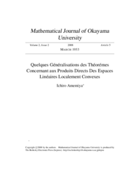 | Abstract | Les deux théorèmes, qui sont établis dans "Sur les espaces linéaires localement convexes" par O. Takenouchi (qui a paru dans ce même Journal, tom. 2, n°1, pp. 57-84), et qui insistent que le produit direct des espaces de chacune de deux espèces c.-à-d. "bornologique" et "tonnelé" est encore l'un de la même espèce, sont vrais sous les conditions moins restrictives. À savoir, Concernant au théorème 14: La restriction d'être complet n'est pas nécessaire. Concernant au théorème 15: La puissance d'ensemble des composants du produit peut être tenue encore plus grand. |