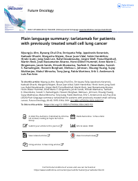 | Citation | Myung-Ju Ahn, Byoung Chul Cho, Enriqueta Felip, Ippokratis Korantzis, Kadoaki Ohashi, Margarita Majem, Oscar Juan-Vidal, Sabin Handzhiev, Hiroki Izumi, Jong-Seok Lee, Rafal Dziadziuszko, Jürgen Wolf, Fiona Blackhall, Martin Reck, Jean Bustamante Alvarez, Horst-Dieter Hummel, Anne-Marie C. Dingemans, Jacob Sands, Hiroaki Akamatsu, Taofeek K. Owonikoko, Suresh S. Ramalingam, Hossein Borghaei, Melissa L. Johnson, Shuang Huang, Sujoy Mukherjee, Mukul Minocha, Tony Jiang, Pablo Martinez, Erik S. Anderson & Luis Paz-Ares (2024) Plain language summary: tarlatamab for patients with previously treated small cell lung cancer, Future Oncology, 20:40, 3355-3364, DOI: 10.1080/14796694.2024.2402152