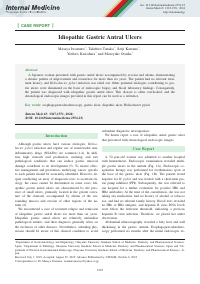 | Abstract | A Japanese woman presented with gastric antral ulcers accompanied by erosion and edema, demonstrating a chronic pattern of improvement and recurrence for more than six years. The patient had no relevant treatment history, and Helicobacter pylori infection was ruled out. Other potential etiologies contributing to gastric ulcers were eliminated on the basis of endoscopic biopsy and blood laboratory findings. Consequently, the patient was diagnosed with idiopathic gastric antral ulcer. This disease is often overlooked, and the chronological endoscopic images provided in this report can be used as a reference.