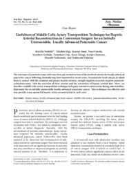 | Abstract | The outcomes of pancreatectomy with resection and reconstruction of the involved arteries for locally advanced pancreatic cancer following chemotherapy have improved in recent years. In pancreatic head cancers in which there is contact with the common and proper hepatic arteries, margin-negative resection requires pancreati-coduodenectomy, with the resection of these arteries and the restoration of hepatic arterial flow. Here, we describe a middle colic artery transposition technique in hepatic arterial reconstruction during pancreatoduo-denectomy for an initially unresectable locally advanced pancreatic cancer. This technique was effective and may provide a new option for hepatic artery reconstruction in such cases.