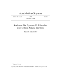 | Abstract | 1. Absorption maxima of hydrochloric biliverdins derived from the natural indirect bilirubin existed at 680 mμ and 375 mμ, but the maxima of biliverdins purified on the column of silica gel existed at 640 mμ and 390 mμ. 2. The natural salt-form bilirubin was oxidized by hydrochloric acid to biliverdin, of which absorption maxima existed at 685 mμ and 370 mμ in a methanolic solution as well as in 5% hydrochloric methanol, but the purified biliverdin in chloroform solution showed the maxima at 640 mμ and 390 mμ. 3. The natural ester-form bilirubin could be transformed into biliverdin by oxidation of its alcoholic solution in the presence of hydrochloric acid. The crude biliverdin had absorption maxima at 645 to 655 mμ, 600 mμ and 320 mμ, and the crude hydrochloric biliverdin had the maxima at 665 to 675 mμ, 620 mμ and in the near ultra-violet range, while the purified biliverdin in chloroform solution had the maxima at 640 mμ and 380 mμ. 4. The biliverdins derived from the indirect, salt-form and ester-form bilirubin had quite similar absorption maxima after purifications by adsorption chromatography. |