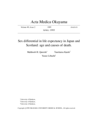 | Abstract | The contribution of age groups and causes of death to the sex difference in life expectancy (SDLE) at birth in Japan and Scotland was estimated for the period 1965-1990. The purpose was to determine the particular age groups and causes of death responsible for the opposite trend of SDLE in the two countries. SDLE has been widening and narrowing in Japan and Scotland, respectively. The availability of complete and reliable data for these two developed countries facilitated the study. A method of decomposing the total SDLE into age and cause of death components was employed. About 40-60% contribution to SDLE was observed for ages after 65 years. Marked increase in the contribution of the 75+ age group and marked decrease in the contribution of ages 45-64 for Japan and Scotland, respectively, had a major effect on the widening and narrowing of SDLE in the two countries, respectively. The contribution of diseases of the circulatory system was the maximum until 1980 in Japan (< or = 1.8 years or 33.6%; cerebrovascular disease alone < or = 23.4%) and until 1990 in Scotland (< or = 3.1 years or 47.0%; ischemic heart disease alone < or = 42.0%). In Japan, the contribution of malignancy had a marked increased from 0.7 year (12.3%) to 2.0 years (32.6%), particularly for the trachea, bronchus and lung, while there was only a small increase in Scotland from 1.0 year (16.6%) to 1.2 years (19.8%) with an increase in the negative contribution of female breast malignancy. In Japan, the contribution of diseases of the respiratory system increased considerably from 0.5 year (8.5%) to 1.1 years (18.1%) while it decreased in Scotland from 1.0 year (16.5%) to 0.6 year (10.7%). About 60-75% of SDLE is due to the above three groups of causes of death. Malignancy and diseases of the respiratory system had a persistently increased contribution in Japan with resultant widening of SDLE by 0.9 year. Diseases of the circulatory system have always had a high contribution. On the contrary, in Scotland the contribution of diseases of the circulatory system and malignancy was practically unchanged and diseases of the respiratory system had a decrease with a consequent narrowing of SDLE by 0.4 year. Further epidemiological study is necessary to detect and analyze in detail the internal gradients (environmental and genetic-biological) of major contributor diseases to SDLE in Japan and Scotland. |
