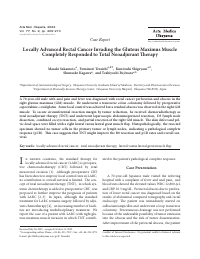 | Abstract | A 70-year-old male with anal pain and fever was diagnosed with rectal cancer perforation and abscess in the right gluteus maximus (GM) muscle. He underwent a transverse colon colostomy followed by preoperative capecitabine+oxaliplatin. Some local control was achieved but a residual abscess was observed in the right GM muscle. To secure circumferential resection margin by tumor reduction, he received chemoradiotherapy as total neoadjuvant therapy (TNT) and underwent laparoscopic abdominoperineal resection, D3 lymph node dissection, combined coccyx resection, and partial resection of the right GM muscle. The skin defect and pelvic dead space were filled with a right lateral vastus lateral great muscle flap. Histopathologically, the resected specimen showed no tumor cells in the primary tumor or lymph nodes, indicating a pathological complete response (pCR). This case suggests that TNT might improve the R0 resection and pCR rates and overall survival.