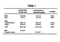 | Abstract | alpha 1-adrenergic blockers (alpha b) remain the first-line therapy in men with lower urinary tract symptoms (LUTS). The current published work advocates continued use of alpha b for their effect to be maintained. However, some patients decide to discontinue use of the medication after their symptoms are relieved and can keep good conditions. In this study, we investigated the natural course of LUTS after the discontinuation of successful treatment of alpha b. Methods: Among 75 patients with LUTS who stopped alpha b medication once their symptoms improved, 60 patients (age, 50-87 years; median, 70) who could be followed for at least 12 months after discontinuation of alpha b were analyzed in this study. Evaluations included a clinical determination of the International Prostate Symptom Score (IPSS), peak flow rate (Qmax) and postvoid residual urine volume (PVR). Upon patient request or in cases of PVR more than 100 mL, administration of alpha b was resumed. Results: Eighteen out of the 60 patients (30%) asked for re-treatment within 12 months after discontinuation (re-treatment group). The other 42 patents were able to maintain good condition without medication (discontinuation group). The IPSS was 15.9, 8.7, 10.1, 10.2, 9.7, 8.8 and 9.0, on the first visit, just before discontinuation, and 1, 3, 6, 9 and 12 months after stopping treatment among the discontinuation group, respectively. Similarly, Qmax was 10.6, 14.8, 14.2, 14.3, 14.7, 13.2 and 13.6 mL/ s, respectively. Treatment periods, prostatic volume and peak flow rates just before discontinuation of medication differed significantly between the re-treatment and discontinuation group. Conclusions: In spite of the short follow-up periods, these results suggest that selected patients with relatively small prostatic volume and good flow rates after therapy can discontinue alpha b medication after their symptoms improve. |