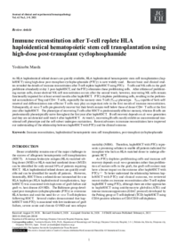 | Abstract | As HLA haploidentical related donors are quickly available, HLA haploidentical hematopoietic stem cell transplantation (haploHSCT) using high-dose post-transplant cyclophosphamide (PTCy) is now widely used. Recent basic and clinical studies revealed the details of immune reconstitution after T-cell replete haploHSCT using PTCy. T cells and NK cells in the graft proliferate abundantly at day 3 post-haploHSCT, and the PTCy eliminates these proliferating cells. After ablation of proliferating mature cells, donor-derived NK cell reconstitution occurs after the second week; however, recovering NK cells remain functionally impaired for at least several months after haploHSCT. PTCy depletes proliferating cells, resulting in the preferential accumulation of Treg and CD4+ T cells, especially the memory stem T cell (T-SCM) phenotype. T-SCM capable of both self-renewal and differentiation into effector T cells may play an important role in the first month of immune reconstitution. Subsequently, de novo T cells progressively recover but their levels remain well below those of donor CD4+ T cells at the first year after haploHSCT. The phenotype of recovering T cells after HSCT is predominantly effector memory, whereas B cells are predominantly phenotypically naive throughout the first year after haploHSCT. B cell recovery depends on de novo generation and they are not detected until week 4 after haploHSCT. At week 5, recovering B cells mostly exhibit an unconventional transitional cell phenotype and the cell subset undergoes maturation. Recent advances in immune reconstitution have improved our understanding of the relationship between haploHSCT with PTCy and the clinical outcome.