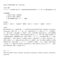 | Abstract | 難治性鼻出血をきたす基礎疾患の一つに遺伝性出血性末梢血管拡張症( Hereditary hemorrhagictelangiectasia:HHT,別名:オスラー病)がある.鼻出血を繰り返していた症例にポリドカノール硬化療法を行い,症状が改善した 2 例を経験したため報告する.症例 1:60 歳代男性.鼻出血を繰り返し,近医で鼻粘膜焼灼を反復したが改善せず当院受診.受診時は毎日鼻出血を繰り返していた.口腔・手指の拡張性小血管病変,胃の末梢血管拡張所見,肝動静脈奇形を認め,HHT と診断した.ポリドカノール硬化療法を実施したところ鼻出血回数は著減した.初回から現在までの 4 年間に計 4 回行い,経過は良好である.症例 2:40 歳代女性.父がHHT と診断されている.鼻出血を週 3 回ほど繰り返すため当院受診.手指・舌の拡張性小血管病変および肝動静脈奇形を認め,HHT と診断した.ポリドカノール硬化療法を 1 回実施し,2 年 7 ヶ月経過した現在も鼻出血なく経過している.簡便な手技で年単位の止血効果が得られ,患者の QOL 向上に寄与するポリドカノール硬化療法は HHT 患者で考慮すべき治療法と考える.
