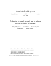 | Abstract | The aim of this study was to explore muscle strength and its relation to exercise habits in Japanese. We used data from 3,018 men and 6,881 women aged 20-69 years and not using medications in a cross-sectional study. Exercise habits and muscle strength, i.e. grip strength and leg strength, were measured. Age-related changes in muscle strength were noted. Exercise habits were found in 984 men (32.6%) and 1,664 women (24.2%). For subjects of both sexes over 50 years, grip strength was significantly decreased with age. However, the ratio of leg strength to body weight significantly decreased with age as early as 30 years in men and 40 years in women. Grip strength, leg strength and the ratio of leg strength to body weight in subjects with exercise habits were significantly higher than those without exercise habits after adjusting for age in both sexes. This standard mean value may provide a useful database for evaluating muscle strength in Japanese adult subjects. |