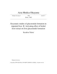 | Abstract | The effect of the boiled liver extract on the velocity of 4-methyl umbelliferone lucuronide formation by mouse liver homogenate was studied. The results were as follows: 1. Addition of mouse or rat liver boiled extract to the complete system for the glucuronide formation produced an increase in the velocity of the glucuronide formation. 2. The boiled liver extract produced the increase in the velocity of the glucuronide formation not as a substrate but as an activator. 3, The activator in the boiled liver extract was relatively heat stable, acid labile, and precipitated as a fairly ethanol-soluble barium salt. The solution of the activator partially purified by ethanol fractionation of the barium salt indicated its absorption maximum at 262 mμ. These results suggested that the most possible substance in the boiled liver extract responsible for the activation of 4methyl umbelliferone glucuronide formation might be a sugar nucleotide. |
