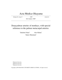 | Abstract | The palmar metacarpal arteries in monkey hands were studied. The palmar metacarpal arteries arose from the deep palmar arch or catella palmaris proximalis and descended in the deep palm, forming the catella palmaris distalis at the distal end of the metacarpus. The palmar metacarpal arteries could be classified into four kinds in relation to the interosseous muscles and metacarpal bones: (i) the superficial palmar metacarpal (sM) arteries descending on the palmar surfaces of the interosseous muscles along the metacarpal bones, (ii) the superficial palmar intermetacarpal (sI) arteries descending on the palmar surfaces of the interosseous muscles along the intermetacarpal spaces, (iii) the deep palmar metacarpal (dM) arteries descending deep in the interosseous muscles along the metacarpal bones, and (iv) the deep palmar intermetacarpal (dI) arteries descending deep in the interosseous muscles along the intermetacarpal spaces. These findings largely coincide with those obtained from studies of the human hand by Murakami (1969). |
