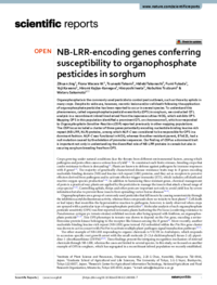 | 抄録 | Organophosphate is the commonly used pesticide to control pest outbreak, such as those by aphids in many crops. Despite its wide use, however, necrotic lesion and/or cell death following the application of organophosphate pesticides has been reported to occur in several species. To understand this phenomenon, called organophosphate pesticide sensitivity (OPS) in sorghum, we conducted QTL analysis in a recombinant inbred line derived from the Japanese cultivar NOG, which exhibits OPS. Mapping OPS in this population identified a prominent QTL on chromosome 5, which corresponded to Organophosphate-Sensitive Reaction (OSR) reported previously in other mapping populations. The OSR locus included a cluster of three genes potentially encoding nucleotide-binding leucine-rich repeat (NB-LRR, NLR) proteins, among which NLR-C was considered to be responsible for OPS in a dominant fashion. NLR-C was functional in NOG, whereas the other resistant parent, BTx623, had a null mutation caused by the deletion of promoter sequences. Our finding of OSR as a dominant trait is important not only in understanding the diversified role of NB-LRR proteins in cereals but also in securing sorghum breeding free from OPS.