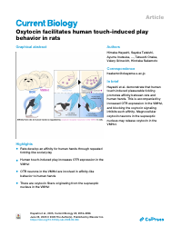 | 抄録 | Pleasant touch sensations play a fundamental role in social bonding, yet the neural mechanisms underlying affinity-like behaviors remain poorly understood. Here, we demonstrate that juvenile-adolescent rats, which naturally engage in social play with peers characterized by rough-and-tumble interactions and 50 kHz ultrasonic vocalizations indicating pleasant sensations, develop a strong affinity for human hands through similar playful contact achieved by repeated tickling with human hands. Using this rat with tickling-induced high affinity for human hands, we discovered that repeated tickling mimicking rough-and-tumble play led to increased oxytocin receptor (OTR) expression in the ventrolateral part of the ventromedial hypothalamus (VMHvl). Inhibition of oxytocin signaling in the VMHvl reduced affinity-like behaviors from rats to human hands. These findings suggest that OTR neurons in VMHvl play an important role in the increase in affinity for human hands induced by pleasant touch sensation with human touch-induced play behavior. Based on retrograde and anterograde tracing studies examining the supraoptic nucleus (SON) and the paraventricular nucleus (PVN) as primary sources of oxytocin, we demonstrate that a subset of oxytocin fibers in the VMHvl originate from the SON, suggesting that affinity-like behavior from rats to human hands may be controlled by oxytocin signaling from magnocellular neurons. Together, this work advances our understanding of how oxytocin shapes social behavior and may inform the development of therapeutic strategies to promote positive social interactions.
