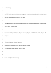 Our study demonstrated that the MRI-based suspension bridge sign can predict an arthroscopically favorable meniscal healing following the MM posterior root repair. The suspension bridge-like MRI finding of the MM would be a useful indicator to evaluate the actual meniscal healing in patients who underwent pullout repairs for MMPRTs.