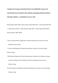 In anesthetic management, it is widely accepted that obese patients are more likely to suffer airway obstructions and reductions in arterial oxygen saturation (SpO2). Therefore, it is important to take special measures to prevent oxygen desaturation during the deep sedation of obese patients. This clinical study examined whether the use of nasal high-flow systems (NHFS) keep higher SpO2 and reduced hypoxemia than conventional nasal cannula during the deep sedation of obese patients with intellectual disabilities for dental treatment. Materials and Methods: Eighteen obese patients (body mass index: >25) with intellectual disabilities who underwent dental sedation were enrolled. In each case, sedation was induced using propofol and maintained at a bispectral index of 50–70. The subjects were randomly assigned to the control oxygen administration (5 L/min via a nasal cannula) or NHFS (40% O2, 40 L/min, 37°C) arm in alternate shifts as a crossover trial. The primary endpoint was the minimum SpO2 value, and the incidence of hypoxemia during dental treatment was also evaluated. Results: The mean minimum SpO2 value was significantly higher in the NHFS arm than in the 4 control arm (95.8 ± 2.1 % vs. 93.6 ± 4.1 %, p=0.0052, 95% confidence interval: 0.608–3.947). Hypoxemic episodes (SpO2: ≤94%) occurred 3 cases (16.7%) in the NHFS arm and 11 case (61.1%) in the control arm (P=0.0076, odds ratio: 0.127, 95% confidence interval 0.0324 to 0.630). Conclusion: NHFS resulted in higher minimum SpO2 and reduced hypoxemia than nasal cannula in obese patients during deep sedation for dental treatment |