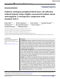 | Citation | Fujii K, Kitamura W, Washio K, Ikeuchi K, Shimono J, Murakami H, et al. Pediatric autologous peripheral blood stem cell collection without heparin using a highly concentrated sodium citrate anticoagulant: A retrospective comparison with standard ACD-A. Transfusion. 2026. https://doi.org/10.1111/trf.70102