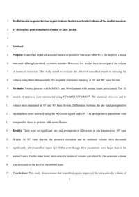 Twenty patients with MMPRTs and 16 volunteers with normal knees participated. The 3D models of meniscus were constructed using SYNAPSE VINCENT®. The meniscal extrusion and its volume were measured at 10° and 90° knee flexion. Differences between the pre- and postoperative examinations were assessed using the Wilcoxon signed-rank test. The postoperative parameters were compared to those in patients with normal knees.