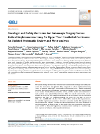 | 抄録 | We systematically reviewed the literature and summarized oncologic and safety outcomes for endoscopic management (EM) compared to radical nephroureterectomy (RNU) for patients with upper tract urothelial carcinoma (UTUC). Studies comparing oncologic and/or safety results for EM versus RNU in patients with UTUC were included in our review. Overall, 13 studies met the criteria, and five studies were included in a meta-analysis using adjusted hazard ratios (HRs) for overall survival (OS), cancer-specific survival (CSS), and bladder recurrence-free survival (BRFS). EM was associated similar OS (HR 1.27, 95% confidence interval [CI] 0.75–2.16), CSS (HR 1.37, 95% CI 0.99–1.91), and BRFS (HR 0.98, 95% CI 0.61–1.55) to RNU, while 28–85% of patients treated with EM experienced upper tract recurrence across the studies. EM required more interventions with a higher cumulative risk of complications and lower likelihood of renal preservation. In summary, EM for low-grade UTUC had comparable survival outcomes to RNU at the cost of higher local recurrence rates resulting in a need for long-term rigorous surveillance and repeated interventions.