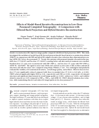 | 抄録 | Iterative reconstruction (IR) improves image quality compared with filtered back projection (FBP). This study investigated the usefulness of model-based IR (forward-projected model-based iterative reconstruction solution [FIRST]) in comparison with FBP and hybrid IR (adaptive iterative dose reduction three-dimensional processing [AIDR 3D]) in low-dose paranasal CT. Twenty-four patients with paranasal sinusitis who underwent standard-dose CT (120 kV) and low-dose CT (100 kV) scanning before and after medical treatment were enrolled. Standard-dose CT scans were reconstructed with FBP (FBP120), and low-dose CT scans with FBP (FBP100), AIDR 3D, and FIRST. The signal-to-noise ratio (SNR) and contrast-to-noise ratio (CNR) in three anatomical