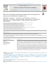 Methods: We analyzed data from 760 asymptomatic men participating in the Shiga Epidemiological Study of Subclinical Atherosclerosis. We assessed baseline (2006–2008) LE8 CVH (low, 0–49 points; moderate, 50–79 points; high, 80–100 points) using its eight components (diet, physical activity assessed by step count, smoking, sleep, body mass index, blood lipids, blood glucose, blood pressure). We quantified CAC at baseline and follow-up of 5 years employing Agatston’s method and defined its baseline prevalence (CAC >0) and progression (employing Berry’s criteria). Modified Poisson regression analyses were used to estimate risk ratio (RR) and 95 % confidence interval (CI), adjusted for age and family history of cardiovascular disease. Results: Participants (mean [SD] age, 63.8 [9.4] years) had 63.2 % and 44.9 % prevalence of CAC at baseline and CAC progression at follow-up, respectively. Individuals with moderate and low CVH at baseline had a higher risk of prevalent CAC (RR [95 % CI], 1.42 [1.18–1.71] and 2.07 [1.67–2.57], respectively) at baseline, compared to those with high CVH. Those with moderate and low CVH at baseline had a higher risk of CAC progression (RR [95 % CI], 1.52 [1.17–1.97] and 1.99 [1.42–2.81], respectively), compared to high CVH individuals. Conclusions: A lower LE8 CVH is significantly associated with a higher risk of prevalence and progression of CAC in general Japanese men. |