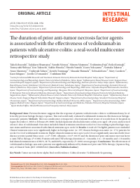 | 抄録 | Background/Aims Previous literature suggests that the response of patients with ulcerative colitis to vedolizumab may be affected by previous biologic therapy exposure. This real-world study evaluated vedolizumab treatment effectiveness in biologicnon-naïve patients.