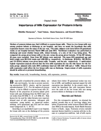 | 抄録 | Mothers of preterm infants may find it difficult to express breast milk. There is a low breast milk rate among preterm infants at discharge at our hospital, and here we tested the hypothesis that milk expression factors were the cause of the low rate. The study subjects were born before 33 gestational weeks at our hospital between March 2005 and June 2014. Nutritional evaluation was performed at discharge and noted whether breast milk, infant formula, or a mix of the 2 was being given. We compared the group given breast milk or the mix versus the group given formula. Of the 337 infants, 40 cases were excluded. Data from 297 infants were analyzed. The mean (SD) gestational age and birth weight were 29.5 (2.4) weeks and 1,230 (391) g, respectively. At discharge, 26 (8.8%), 102 (33.3%), and 174 (57.9%) infants were given breast milk, formula, and the mix, respectively. A multivariate logistic regression analysis showed that the first milk expression (h) was the risk factor for the formula group: adjusted odds ratio (95% confidence interval) 1.06 (1.02-1.09) and p=0.002. Delayed first milk expression could affect the low breast milk rate at discharge. Improvement of milk expression should be achieved to promote breastfeeding.
