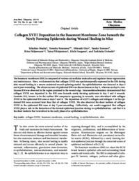 | 抄録 | The basement membrane (BM) is composed of various extracellular molecules and regulates tissue regeneration and maintenance. Here, we demonstrate that collagen XVIII was spatiotemporally expressed in the BM during skin wound healing in a mouse excisional wound-splinting model. Re-epithelialization was detected at days 3 and 6 post-wounding. The ultrastructure of epidermal BM was discontinuous at day 3, whereas on day 6 a continuous BM was observed in the region proximal to the wound edge. Immunohistochemistry demonstrated that collagen XVIII was deposited in the BM zone beneath newly forming epidermis in day 3 and 6 wounds. Laminin-332, known to be the earliest BM component appearing in wounds, was colocalized with collagen XVIII in the epidermal BM zone at days 3 and 6. The deposition of α1(IV) collagen and nidogen-1 in the epidermal BM zone occurred later than that of collagen XVIII. We also observed the short isoform of collagen XVIII in the epidermal BM zone at day 3 post-wounding. Collectively, our results suggested that collagen XVIII plays a role in the formation of the dermal-epidermal junction during re-epithelialization, and that it is the short isoform that is involved in the early phase of re-epithelialization.