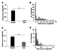 | 抄録 | Understanding uptake and redistribution of essential minerals or sequestering of toxic elements is important for optimized crop production. Although the mechanisms controlling mineral transport have been elucidated in rice and other species, little is understood in sorghum—an important C4 cereal crop. Here, we assessed the genetic factors that govern grain ionome profiles in sorghum using recombinant inbred lines (RILs) derived from a cross between BTx623 and NOG (Takakibi). Pairwise correlation and clustering analysis of 22 elements, measured in sorghum grains harvested under greenhouse conditions, indicated that the parental lines, as well as the RILs, show different ionomes. In particular, BTx623 accumulated significantly higher levels of cadmium (Cd) than NOG, because of differential root-to-shoot translocation factors between the two lines. Quantitative trait locus (QTL) analysis revealed a prominent QTL for grain Cd concentration on chromosome 2. Detailed analysis identified SbHMA3a, encoding a P1B-type ATPase heavy metal transporter, as responsible for low Cd accumulation in grains; the NOG allele encoded a functional HMA3 transporter (SbHMA3a-NOG) whose Cd-transporting activity was confirmed by heterologous expression in yeast. BTx623 possessed a truncated, loss-of-function SbHMA3a allele. The functionality of SbHMA3a in NOG was confirmed by Cd concentrations of F2 grains derived from the reciprocal cross, in which the NOG allele behaved in a dominant manner. We concluded that SbHMA3a-NOG is a Cd transporter that sequesters excess Cd in root tissues, as shown in other HMA3s. Our findings will facilitate the isolation of breeding cultivars with low Cd in grains or in exploiting high-Cd cultivars for phytoremediation.