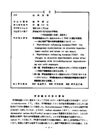| タイトル(別表記) | 甲状腺刺激ホルモン放出ホルモン(TRH)に関する研究 特に視床下部の向甲状腺領域について 第1編:甲状腺刺激ホルモン放出ホルモン(TRH)の正常ラット視床下部諸部位に於ける分布。) 第2編:甲状腺刺激ホルモン放出ホルモン(TRH)のトリヨードサイロニン,甲状腺摘出および急性寒冷刺激後の視床下部諸部位に於ける変動。)