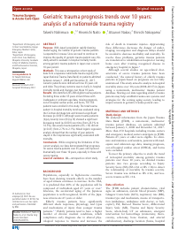 | 抄録 | Purpose With Japan's population rapidly skewing toward aging, the number of geriatric trauma patients is expected to increase. Since we need to continue to improve the quality of geriatric trauma patient care, this study aimed to evaluate in-hospital mortality trends among geriatric trauma patients in Japan over a recent 10-year period. Methods This was a retrospective cohort study of data from a Japanese nationwide trauma registry (the Japan National Trauma Data Bank) on patients admitted between January 1, 2008 and December 31, 2017. Geriatric patients were defined as those 65 years old and older. The primary outcome was to clarify in-hospital mortality trends and changes over these 10 years. Results We identified 265 268 eligible trauma patients. Excluding those under 65 years old and those with inadequate or unknown age data, missing prognosis, out-of-hospital cardiac arrest, and burns, 107 766 patients were enrolled in this study. The total trauma patient in-hospital mortality trend was evaluated using the Cochran-Armitage test and showed a significant decrease (p<0.001). Although severe trauma patients (Injury Severity Score (ISS) >= 16) showed a significant decreasing trend (p<0.001) over time (from 26.1% to 14.5%), less-severe trauma patients (ISS <16) did not (p=0.41) (from 2.7% to 2.1%). Mixed logistic regression analysis showed that the number of year patients stayed in the hospital was significantly associated with mortality. Conclusions While recognizing the limitations of the current analysis, our data demonstrated that prognoses for severe trauma patients over 65 years old improved dramatically over these 10 years, especially in those with severe trauma.