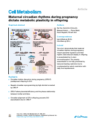 | 抄録 | Tissue-level oscillation is achieved by tissue-intrinsic clocks along with network-dependent signals originating from distal organs and organismal behavior. Yet, it remains unexplored whether maternal circadian rhythms during pregnancy influence fetal rhythms and impact long-term susceptibility to dietary challenges in offspring. Here, we demonstrate that circadian disruption during pregnancy decreased placental and neonatal weight yet retained transcriptional and structural maturation. Intriguingly, diet-induced obesity was exacerbated in parallel with arrhythmic feeding behavior, hypothalamic leptin resistance, and hepatic circadian reprogramming in offspring of chronodisrupted mothers. In utero circadian desynchrony altered the phase-relationship between the mother and fetus and impacted placental efficiency. Temporal feeding restriction in offspring failed to fully prevent obesity, whereas the circadian alignment of caloric restriction with the onset of the active phase virtually ameliorated the phenotype. Thus, maternal circadian rhythms during pregnancy confer adaptive properties to metabolic functions in offspring and provide insights into the developmental origins of health and disease.