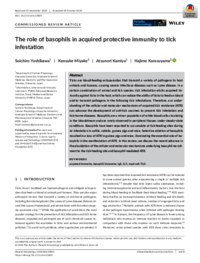 | 抄録 | Ticks are blood‐feeding ectoparasites that transmit a variety of pathogens to host animals and humans, causing severe infectious diseases such as Lyme disease. In a certain combination of animal and tick species, tick infestation elicits acquired immunity against ticks in the host, which can reduce the ability of ticks to feed on blood and to transmit pathogens in the following tick infestations. Therefore, our understanding of the cellular and molecular mechanisms of acquired tick resistance (ATR) can advance the development of anti‐tick vaccines to prevent tick infestation and tick‐borne diseases. Basophils are a minor population of white blood cells circulating in the bloodstream and are rarely observed in peripheral tissues under steady‐state conditions. Basophils have been reported to accumulate at tick‐feeding sites during re‐infestation in cattle, rabbits, guinea pigs and mice. Selective ablation of basophils resulted in a loss of ATR in guinea pigs and mice, illuminating the essential role of basophils in the manifestation of ATR. In this review, we discuss the recent advance in the elucidation of the cellular and molecular mechanisms underlying basophil recruitment to the tick‐feeding site and basophil‐mediated ATR.