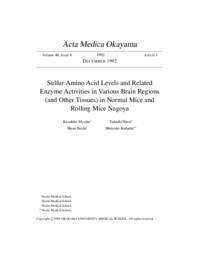 | 抄録 | The contents of the sulfur amino acids, and the activities of cystathionine beta-synthase and cystathionine gamma-lyase were measured in various regions of the brain and several other tissues in both normal mice and rolling mice Nagoya. The cystathionine content and cystathionine beta-synthase activity were found to be unevenly distributed in various regions of the brain in both normal mice and rolling mice Nagoya, being highest in the cerebellum. Except for the mesencephalon and thalamus plus hypothalamus, the cystathionine content and cystathionine beta-synthase activity in the brain regions of rolling mice Nagoya were much higher than those of the normal mice. The cystathionine content after D,L-propargylglycine treatment was also found to be unevenly distributed in various brain regions in both normal mice and rolling mice Nagoya. The concentrations of cystine and methionine were also higher in all regions of the brain of rolling mice Nagoya than those of normal mice, while the concentration of taurine in the various regions of the brain was almost the same in normal mice and rolling mice Nagoya. Cystathionine beta-synthase and cystathionine gamma-lyase activities in the liver, kidney, and pancreas were almost the same in both the normal mice and rolling mice Nagoya. |