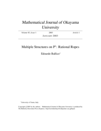 | 抄録 | Here we study the theory of rational ropes (multiple structures on P1 whose ideal sheaf, F, has square zero) introduced by K. Chandler. F is a vector bundle on P1 and here we show that several properties of the rope depend on the splitting type of F. We study the moduli space of all rational ropes with F as ideal sheaf. |