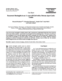 | 抄録 | Cases of recurrent meningitis in elderly patients with a spontaneous cerebrospinal fistula have been reported, and in some of these patients, cystic lesions were thought to be the underlying cause. We report a case of recurrent meningitis in an 11-year-old Japanese girl with an arachnoid cyst in the petrous apex. Pulsation of the cystic lesion was thought to cause bone erosion, leading to the formation of a fistula. Magnetic resonance imaging was useful in evaluating the arachnoid cyst and fistula. During 2 years of follow-up, the osteolytic lesion enlarged and the rate of bone erosion was higher than expected.
